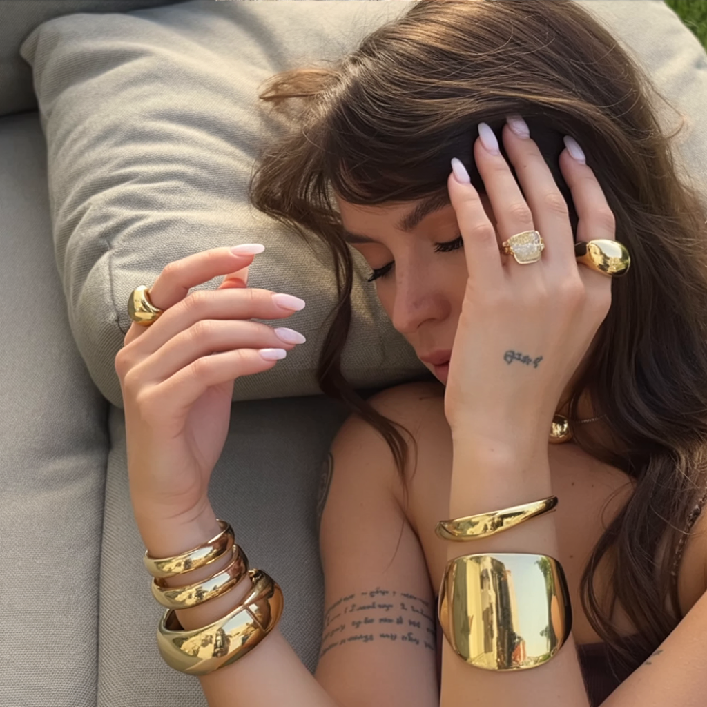 Soft evening light, rippled sand, and a warm golden shine—this cuff is designed to stand out without trying too hard. Its flowing curves catch every reflection, giving your look an effortless, elevated feel—like carrying a touch of the beach with you. Minimal, sculptural, and made to be noticed.